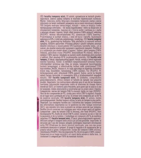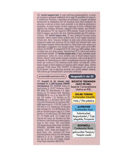 Băng vệ sinh Tampon Facelle với công nghệ SoftSilk mới, cùng lớp vỏ lông cừu mềm, mịn và thiết kế đầu tampon rất nhỏ, giúp tampon có thể dễ dàng đưa vào và tháo ra. Nhờ cấu trúc rãnh đặc biệt, tampon giãn nở đều và thích ứng với cơ thể, giúp chất lỏng được dẫn vào bên trong một cách an toàn. Lõi tampon được làm từ 100% viscose, sợi rút được làm từ 100% cotton. Bảo vệ tối ưu và an toàn hơn.