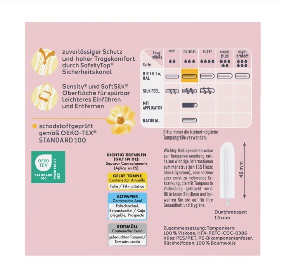 Thành phần: Lõi tampon bao gồm 100% viscose. Sợi rút được làm bằng 100% cotton.