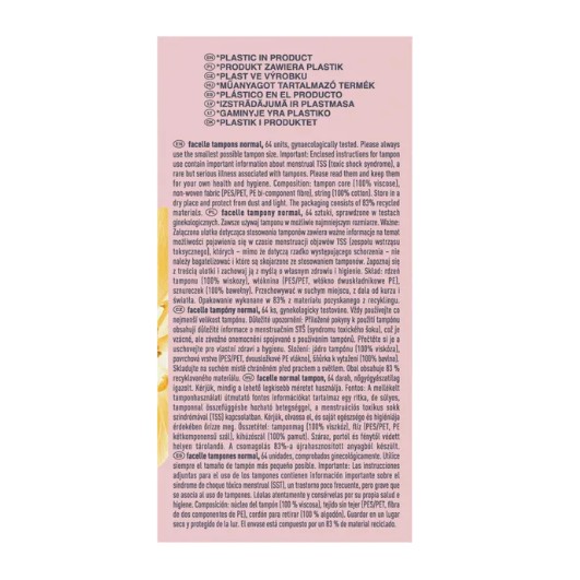 Băng vệ sinh Tampon Facelle với công nghệ SoftSilk mới, cùng lớp vỏ lông cừu mềm, mịn và thiết kế đầu tampon rất nhỏ, giúp tampon có thể dễ dàng đưa vào và tháo ra. Nhờ cấu trúc rãnh đặc biệt, tampon giãn nở đều và thích ứng với cơ thể, giúp chất lỏng được dẫn vào bên trong một cách an toàn. Lõi tampon được làm từ 100% viscose, sợi rút được làm từ 100% cotton. Bảo vệ tối ưu và an toàn hơn.