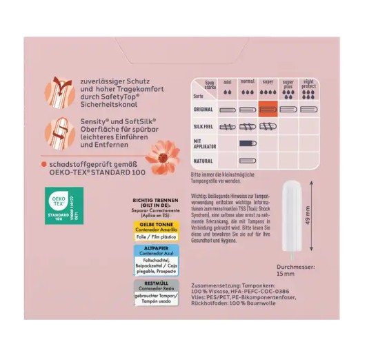 Thành phần: Lõi tampon bao gồm 100% viscose. Sợi rút được làm bằng 100% cotton.