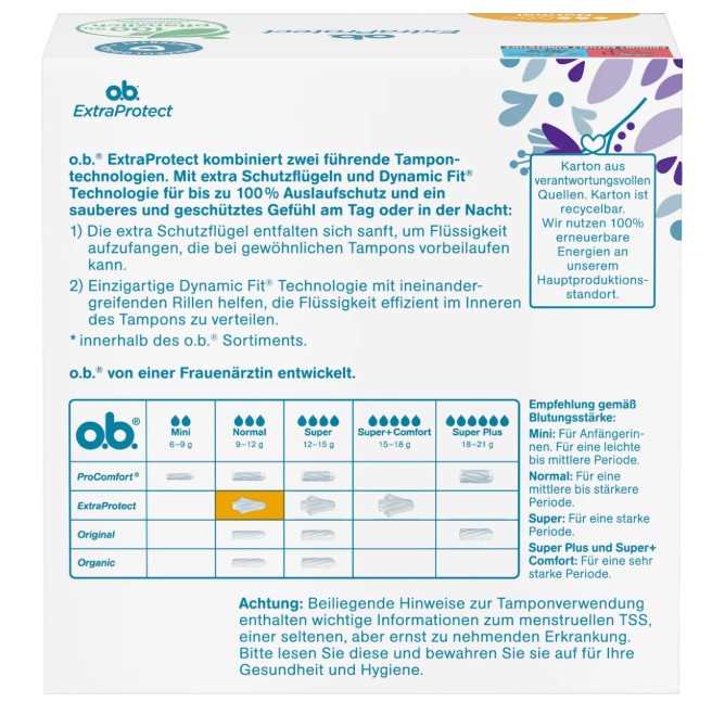 Băng vệ sinh Tampon o.b. Extra Protect được phát triển bởi bác sĩ phụ khoa của Đức, giúp dễ dàng sử dụng và bảo vệ đáng tin cậy. Kết hợp 2 công nghệ hàng đầu với các cánh bảo vệ bổ sung và công nghệ Dynamic Fit, cho khả năng chống rò rỉ đặc biệt cả ngày lẫn đêm, giúp thấm hút nhanh và khô thoáng. Loại bỏ cảm giác ẩm ướt và mùi khó chịu như khi dùng BVS thông thường.