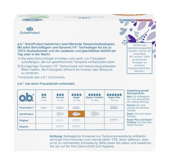 Băng vệ sinh Tampon o.b. Extra Protect được phát triển bởi bác sĩ phụ khoa của Đức, giúp dễ dàng sử dụng và bảo vệ đáng tin cậy. Kết hợp 2 công nghệ hàng đầu với các cánh bảo vệ bổ sung và công nghệ Dynamic Fit, cho khả năng chống rò rỉ đặc biệt cả ngày lẫn đêm, giúp thấm hút nhanh và khô thoáng. Loại bỏ cảm giác ẩm ướt và mùi khó chịu như khi dùng BVS thông thường.