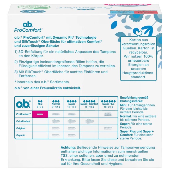 Băng vệ sinh Tampon o.b. Pro Comfort được phát triển bởi bác sĩ phụ khoa của Đức, giúp dễ dàng sử dụng và bảo vệ đáng tin cậy. Công nghệ Smooth siêu mịn và bề mặt lụa mềm mại (Silky Touch) lướt nhẹ nhàng vào cửa mình, cùng các rãnh xoắn mở, giúp thấm hút nhanh và khô thoáng. Loại bỏ cảm giác ẩm ướt và mùi khó chịu như khi dùng BVS thông thường.