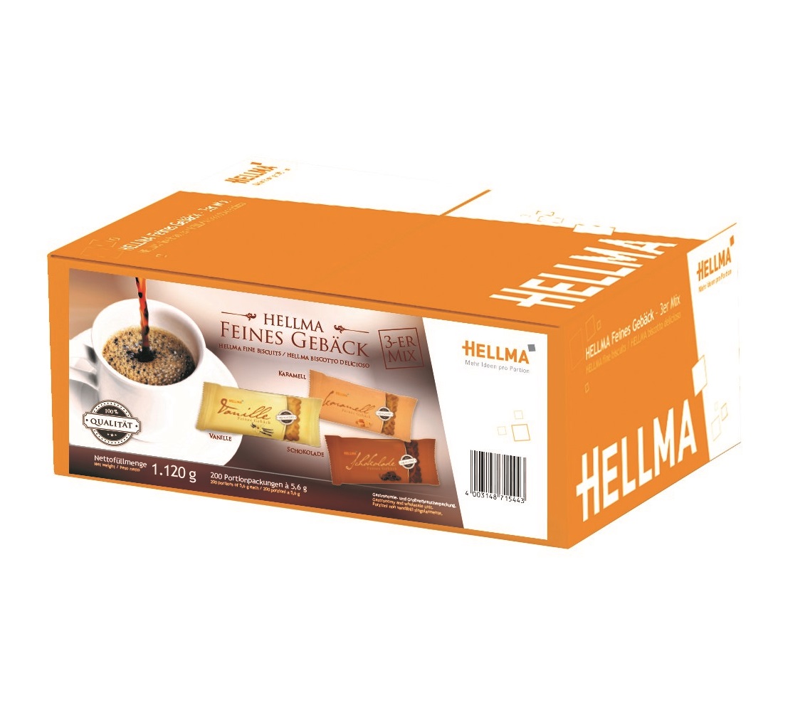 Bánh quy HELLMA Feines Gebäck mix 3 vị là dòng bánh quy cao cấp của thương hiệu Hellma (Đức). Feines Gebäck nghĩa là tinh tế cao cấp. Hộp bánh gồm 3 hương vị hấp dẫn: sô cô la, vani và caramel, được nướng giòn tan và ngon khó cưỡng. Hộp lớn 1,12 kg gồm 200 chiếc bánh được đóng gói riêng lẻ, rất thuận tiện để chia sẻ và sử dụng, không lo bảo quản hay bánh bị ỉu. Lý tưởng để thưởng thức cùng cà phê, trà hay là món ăn vặt bổ sung thêm năng lượng. Cũng thích hợp để làm quà tặng hay tiếp khách ngày lễ Tết hay các dịp sinh nhật, hội họp.