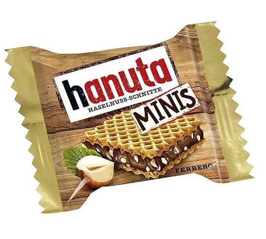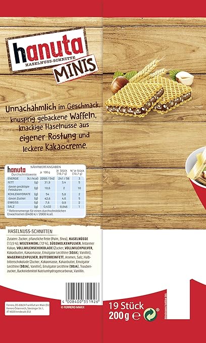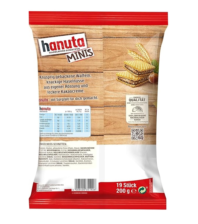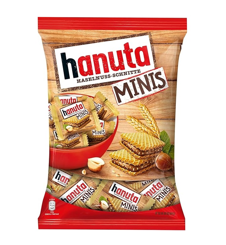 Bánh xốp Hanuta Minis nhân socola và hạt phỉ với lớp kem béo ngậy của hạt phỉ rang giòn và socola thơm lừng, kẹp giữa 2 lớp vỏ bánh xốp lúa mì giòn tan, tạo nên hương vị thơm ngon độc đáo hấp dẫn khó quên. Mềm xốp, giòn tan, thơm mùi hạt, đó là Hanuta. Là món ăn nhẹ giàu dinh dưỡng, thơm ngon ngọt béo hài hòa, giòn tan, cung cấp năng lượng. Người lớn hay trẻ nhỏ đều rất thích. Thích hợp làm món ăn nhẹ ngon miệng giữa các bữa ăn hay dùng tráng miệng, dùng cùng cà phê hay trà. Túi gồm 19 chiếc được bọc gói riêng biệt rất thuận tiện để chia sẻ và sử dụng.