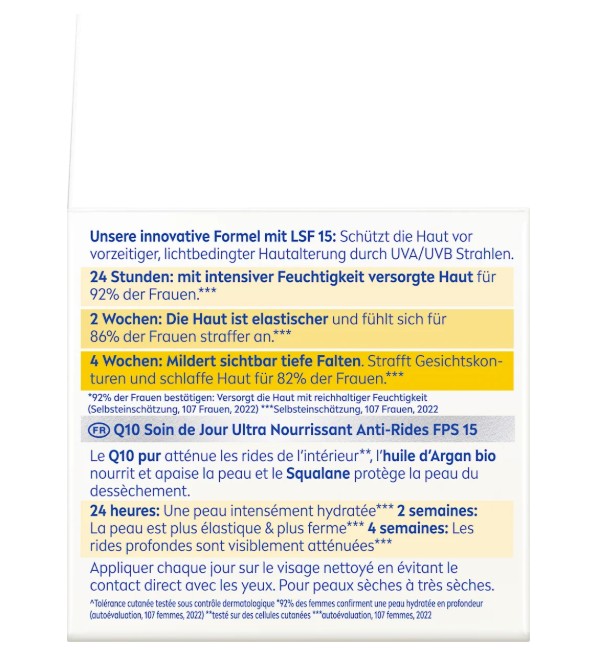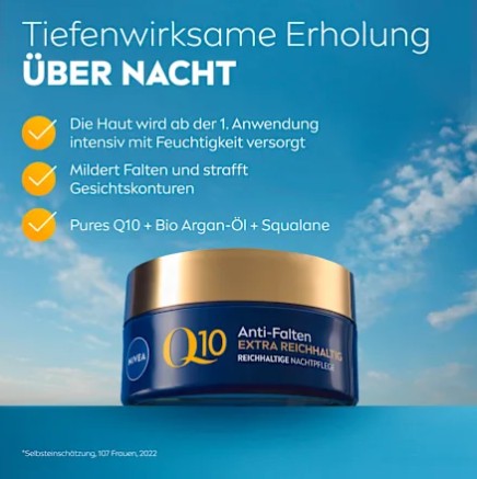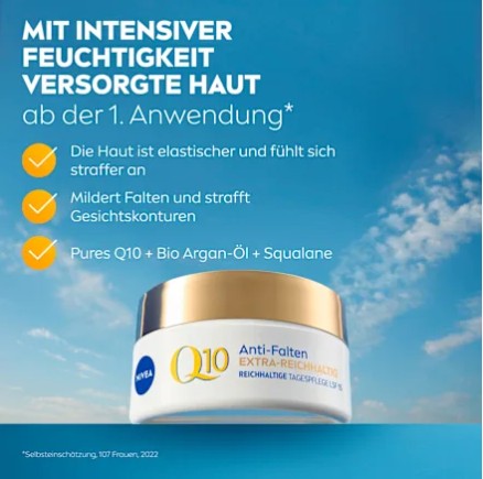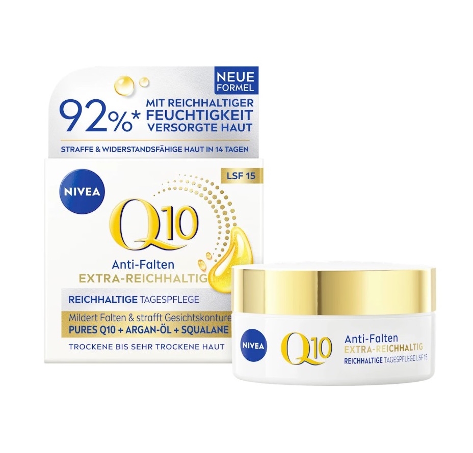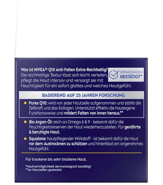 Bộ kem dưỡng da Nivea Q10 Anti-Falten Extra Reichhaltige được phát triển đặc biệt dành cho da RẤT KHÔ với dưỡng chất cực kì phong phú. Công thức với Q10 giống da và 100% dầu argan hữu cơ – giàu Omega 6 & 9, cấp ẩm chuyên sâu cho da suốt 24h. Coenzyme Q10 tác động kép là một chất chống oxy hóa bảo vệ, nó chống lại quá trình lão hóa tự nhiên của da. Làm giảm rõ rệt nếp nhăn và làm săn chắc da. Đồng thời nuôi dưỡng làn da mềm mại, bảo vệ da khỏi bị khô. Làn da đều màu, săn chắc và trẻ trung hơn rõ rệt.