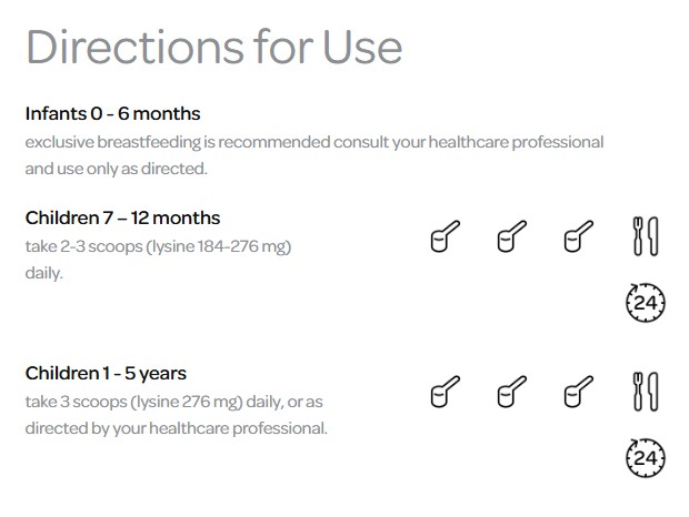 Trẻ em 1 – 5 tuổiUống 3 muỗng (lysine 276 mg) mỗi ngày, hoặc theo hướng dẫn của chuyên gia chăm sóc sức khỏe.