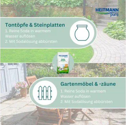 Vườn: Lý tưởng để loại bỏ bụi bẩn, cây xanh và cặn vôi. Liều dùng: 4-5 thìa canh (40-50g) cho mỗi 5 lít nước. Đá phiến, tường gỗ, hàng rào và đồ nội thất sân vườn: Chà bề mặt và đồ vật bằng dung dịch ấm. Điều này sẽ bảo vệ cây cối xung quanh. – Thử nghiệm trên một khu vực kín đáo trước trên sàn đá quý (ví dụ: đá granit đánh bóng). Tường và Cửa: Làm sạch bằng dung dịch nóng. – Rửa kỹ bằng nước sạch trước khi sơn lại. Chậu hoa đất sét – Để loại bỏ cặn vôi, ngâm chậu trong dung dịch soda ấm trong vài giờ. (1 thìa cà phê hoặc 3g cho 1 lít).