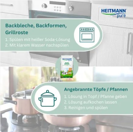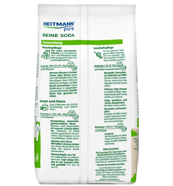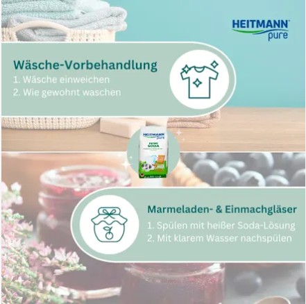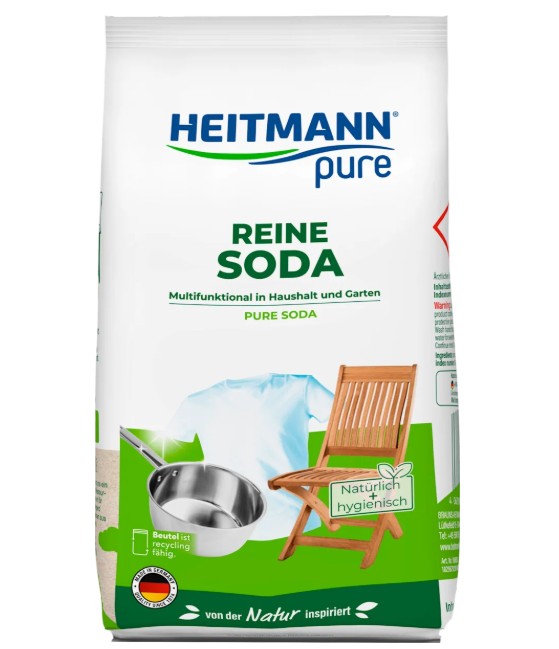 Bột tẩy đa năng HEITMANN pure Reine Soda là bột tẩy rửa đa năng từ Đức được làm từ soda khoáng tự nhiên, giúp loại bỏ bụi bẩn, dầu mỡ, vết bẩn, mùi hôi một cách mạnh mẽ và hợp vệ sinh, đảm bảo vệ sinh an toàn thực phẩm. Hòa tan mảng bám xanh và cặn vôi, giúp các thiết bị và bề mặt sáng bóng như mới. Tăng cường khả năng làm sạch khi được thêm vào nước rửa chén và các sản phẩm tẩy rửa khác. Có thể dùng để vệ sinh bếp, nồi chảo, đồ dùng, quần áo, sàn nhà và các bề mặt khác.