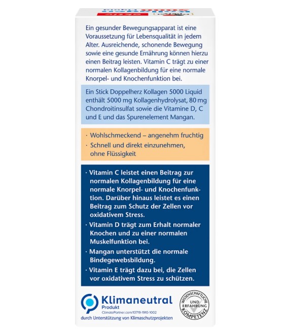 Collagen nước Doppelherz Kollagen 5000 Liquid chứa 5000 mg collagen thủy phân, 80 mg chondroitin sulfate, cùng với các vitamin D, C, E và nguyên tố vi lượng mangan. Sự kết hợp của các nguyên tố vi lượng và vitamin đặc biệt góp phần bảo vệ sức khỏe cơ xương và bảo vệ tế bào. Collagen thủy phân và chondroitin sulfate, giúp làm trơn khớp, giảm đau nhức, ngăn ngừa các bệnh về xương khớp (viêm khớp, thoái khóa…). Ngoài ra còn có công dụng làm đẹp da tóc móng, chống lão hóa. Uống trực tiếp không cần nước, hương vị đào thơm ngon.