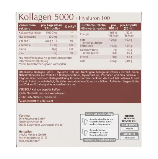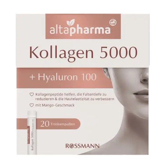 Collagen thủy phân altapharma Kollagen 5000 + Hyaluron 100 là collagen uống với hương vị trái cây (trái xoài) thơm ngon. Đặc điểm của collagen thủy phân là chứa nồng độ tinh chất cao, cô đặc (được đựng trong các ống nhỏ gọi là Ampulle), dễ hấp thụ hơn. Sản phẩm có chứa sự kết hợp của của các vitamin và dưỡng chất được lựa chọn cho làn da đẹp tự nhiên từ bên trong. Giúp làn da săn chắc, căng mịn, chống lão hóa, giảm nếp nhăn, trẻ hóa làn da. Da trở nên trẻ trung, sáng mịn và đẹp hơn.