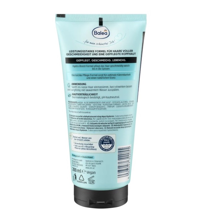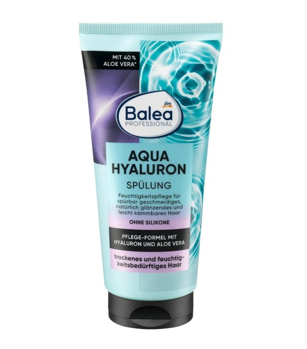 Dầu xả Balea Professional Aqua Hyaluron dưỡng ẩm chuyên sâu, chứa các thành phần dưỡng ẩm tự nhiên như axit hyaluronic và 40% chiết xuất lô hội cô đặc, giúp chăm sóc tóc chuyên sâu mà không làm nặng tóc. Công thức dịu nhẹ giúp làm sạch tóc và đặc biệt dịu nhẹ với da đầu. Phục hồi mái tóc khô và mất nước. Làm ẩm mềm và óng mượt rõ rệt đến tận ngọn tóc. Không chứa silicone.