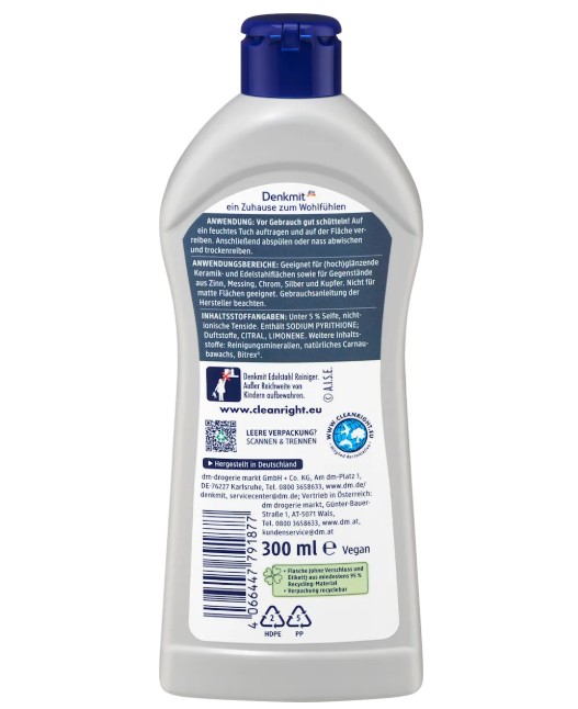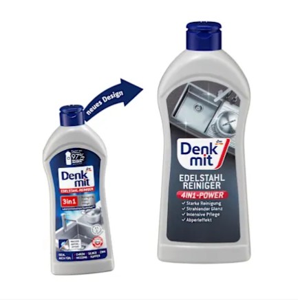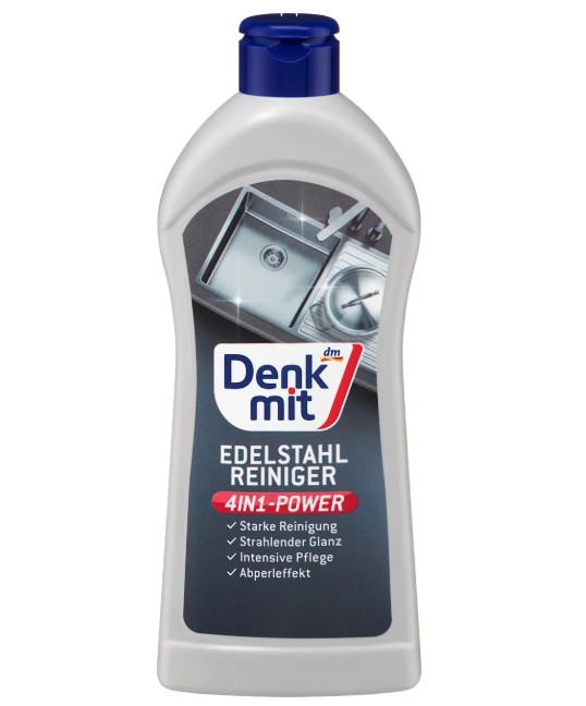 Dung dịch tẩy inox Denkmit Edelstahlreiniger 4in1 làm sạch lý tưởng tất cả các bề mặt làm bằng thép không gỉ và gốm có bề mặt bóng, cũng như các đồ vật làm bằng thiếc, đồng thau, crôm, bạc và đồng. Có 4 công dụng trong 1: làm sạch, đánh bóng, chăm sóc chuyên sâu, chống đóng cặn, dung dịch tẩy inox Denkmit làm sáng bóng trở lại các bề mặt trong nhà bếp, nhà vệ sinh của bạn ngay tức thì. Công nghệ chống giọt nước bảo vệ các bề mặt chống bị cặn bám trở lại trong thời gian dài, mang lại vẻ sáng bóng dài lâu. Với 97% thành phần có nguồn gốc tự nhiên, vệ sinh an toàn đáng tin cậy, không hại da tay.