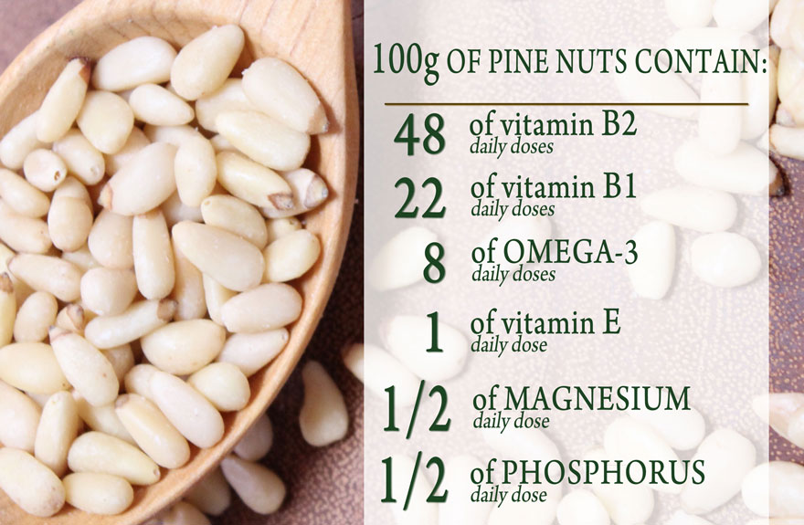 - Hạt thông chứa nhiều vitamin E hơn các sản phẩm phổ biến khác, chẳng hạn như dầu ô liu, dầu mầm lúa mì hoặc dầu dừa. Vitamin nhóm E, hay tocopherol, rất quan trọng và cần thiết để đảm bảo sự truyền tải đầy đủ vật chất di truyền.