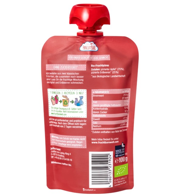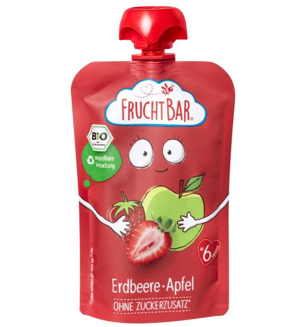 Hoa quả nghiền hữu cơ Fruchtbar là thức ăn dặm cho bé từ 6 tháng tuổi của thương hiệu hữu cơ hàng đầu tại Đức – Fruchtbar. Thành phần 100% tù trái cây và rau củ hữu cơ tự nhiên được mix rất khéo theo tỷ lệ vừa vặn và ngon miệng, rất thích hợp cho bé ăn dặm. Túi bóp rất tiện sử dụng cho bé mọi lúc mọi nơi, giúp cung cấp vitamin, khoáng chất, chất xơ và chất dinh dưỡng đa dạng cho bé. Không chứa đường, vị ngọt từ đường trái cây rau củ tự nhiên, không chứa phụ gia, rất an toàn cho bé.