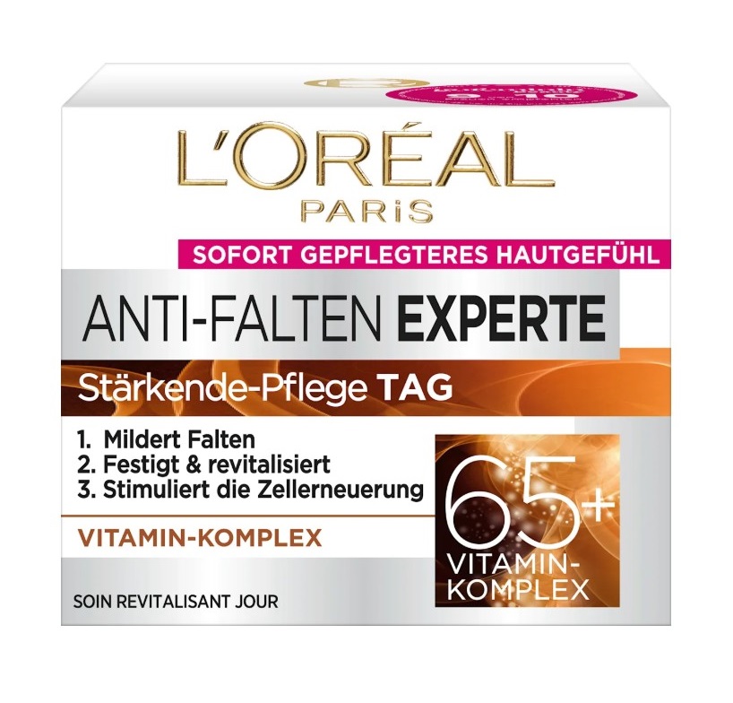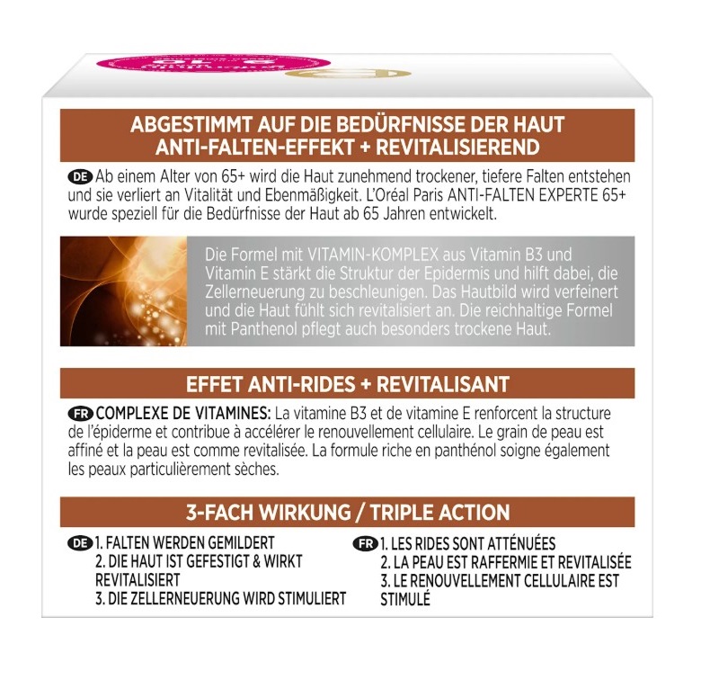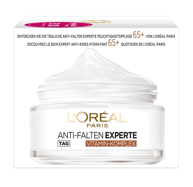 Từ 65 tuổi, làn da giảm hẳn khả năng tự tái tạo, các nếp nhăn sâu xuất hiện, da bị lão hóa nhanh và các đốm nâu xuất hiện nhiều. Kem dưỡng da L’Oréal Paris Tagescreme Anti-Falten Experte 65+ ban ngày được phát triển đặc biệt cho các nhu cầu của da từ 65 tuổi, bổ sung phức hợp Vitamin nuôi dưỡng và củng cố cấu trúc da rõ rệt. Làm mềm và giảm các nếp nhăn sâu. Các đốm sắc tố sậm màu mờ đi và giảm trông thấy. Làm chậm quá trình lão hóa, cho làn da mịn và tươi trẻ.