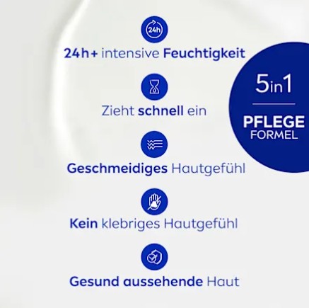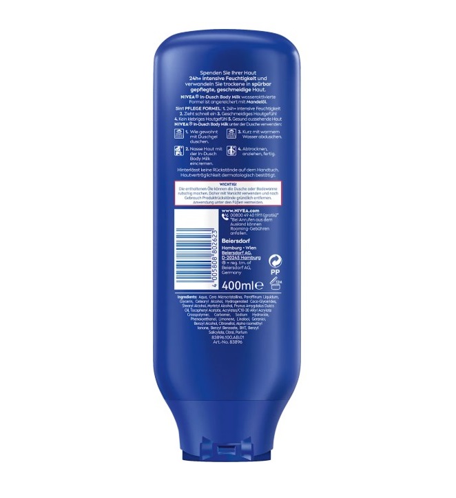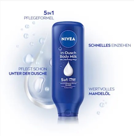 Kem xả dưỡng thể Nivea In-dusch Body Milk mang đến công thức 5 trong 1 đột phá được phát triển đặc biệt cho nhu cầu của da khô. Dưỡng ẩm chuyên sâu, thấm nhanh mà không nhờn dính, chăm sóc da ngay trong khi tắm. Với chiết xuất từ dầu hạnh nhân giúp dễ dàng hấp thụ các dưỡng chất vào da, dưỡng ẩm, chăm sóc và làm mềm da, đem lại một sự thay đổi tích cực cho da. Bạn sẽ cảm thấy sự thay đổi đáng chú ý ngay sau khi sử dụng sản phẩm kem xả dưỡng thể của NIVEA Đức.