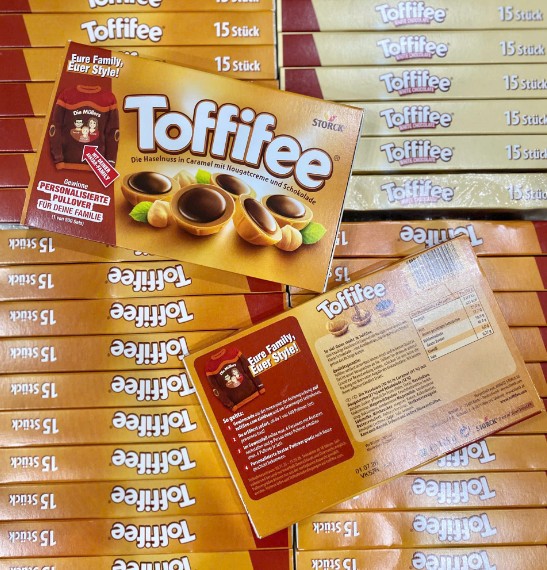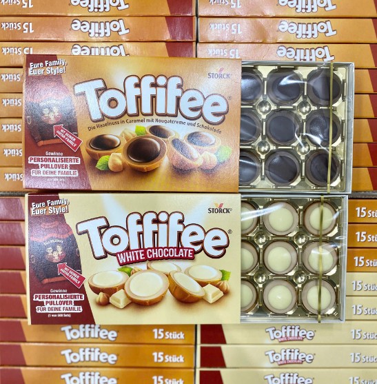 Kẹo mềm caramen chocolate nhân hạt dẻ Toffifee từ thương hiệu STORCK nổi tiếng của Đức. Là kẹo mềm độc đáo kết hợp hoàn hảo giữa hạt phỉ giòn bùi, lớp nougat kem mịn, vỏ caramel dai dẻo, và phủ một giọt sô cô la đen bên trên, tạo nên trải nghiệm 4 tầng hương vị thơm ngon, hấp dẫn. Là món ăn vặt được cả trẻ nhỏ và người lớn yêu thích. Cũng thích hợp được thêm vào các giỏ quà tặng, hay bày biện trong dịp lễ Tết.