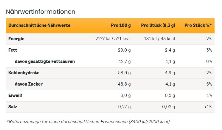 Thành phần: Đường, chất béo thực vật (dầu cọ, dầu hạt mỡ), hạt phỉ, siro glucose, sữa bột tách béo, siro sorbitol giữ ẩm, khối lượng ca cao, sữa tách béo cô đặc, whey đường cô đặc, lactose, ca cao giảm béo, bơ ca cao, bơ tinh luyện, siro đường mía, sản phẩm từ whey, chất nhũ hóa lecithin (đậu nành), muối, hương liệu.