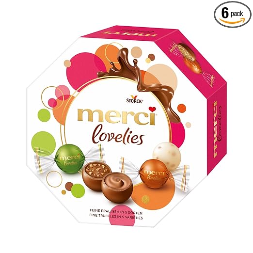 Kẹo socola Merci Lovelies từ thương hiệu STORCK nổi tiếng của Đức. Với thiết kế hộp sang trọng (hình bát giác), kẹo socola dạng viên hình cầu với nhiều loại nhân như hạt dẻ, hạnh nhân, kem sữa, cà phê, từ socola sữa, socola trắng và socola đen. Lý tưởng để làm quà tặng hoặc nhâm nhi cùng đồ uống, thể hiện sự trân trọng và tình yêu thương. Kẹo có hương vị thơm ngon, hấp dẫn. Là món ăn vặt được cả trẻ nhỏ và người lớn yêu thích. Cung cấp năng lượng và dinh dưỡng. Cũng thích hợp được thêm vào các giỏ quà tặng, hay bày biện trong dịp lễ Tết.