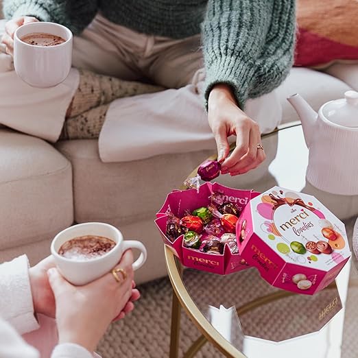 Kẹo socola Merci Lovelies từ thương hiệu STORCK nổi tiếng của Đức. Với thiết kế hộp sang trọng (hình bát giác), kẹo socola dạng viên hình cầu với nhiều loại nhân như hạt dẻ, hạnh nhân, kem sữa, cà phê, từ socola sữa, socola trắng và socola đen. Lý tưởng để làm quà tặng hoặc nhâm nhi cùng đồ uống, thể hiện sự trân trọng và tình yêu thương. Kẹo có hương vị thơm ngon, hấp dẫn. Là món ăn vặt được cả trẻ nhỏ và người lớn yêu thích. Cung cấp năng lượng và dinh dưỡng. Cũng thích hợp được thêm vào các giỏ quà tặng, hay bày biện trong dịp lễ Tết.