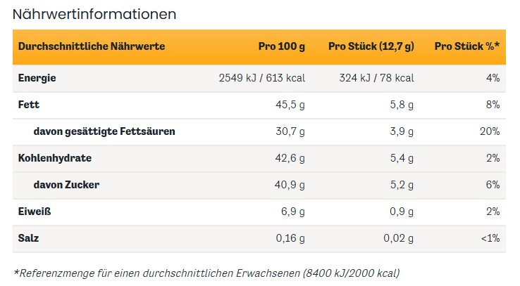 Thành phần: Đường, bơ ca cao, khối ca cao, sữa bột nguyên kem, chất béo dừa, hạt phỉ xay (2,9%), bơ tinh luyện, bột sữa bơ, lactose, sữa bột tách béo, chất nhũ hóa: lecithin (đậu nành), hương liệu, cà phê, bột kem, muối.