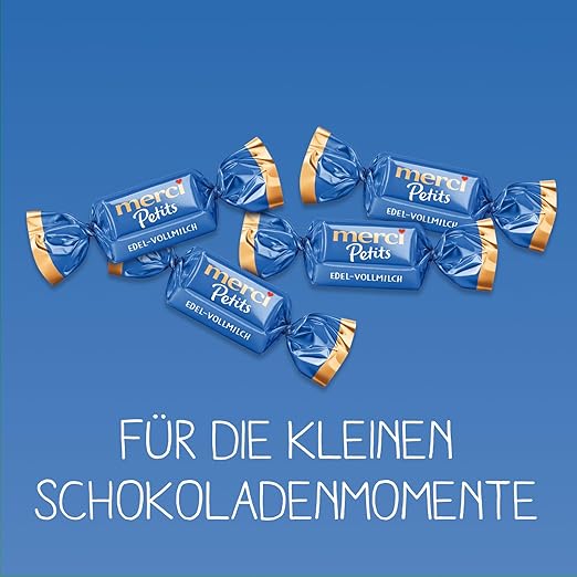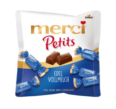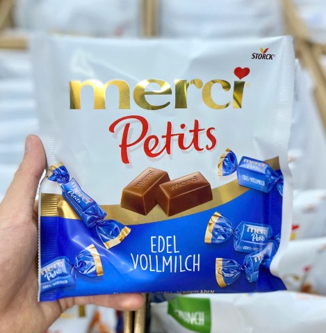 Kẹo socola Merci Petits Edel Vollmilch socola sữa từ thương hiệu STORCK nổi tiếng của Đức. Từng viên kẹo nhỏ được bọc riêng, với hương vị socola sữa béo ngậy tinh tế. Kẹo có hương vị thơm ngon, hấp dẫn. Là món ăn vặt được cả trẻ nhỏ và người lớn yêu thích. Cung cấp năng lượng và dinh dưỡng. Cũng thích hợp được thêm vào các giỏ quà tặng, hay bày biện trong dịp lễ Tết.