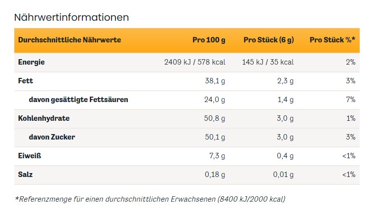Thành phần: Đường, bơ ca cao, sữa bột nguyên kem (23,5%), khối ca cao, bơ tinh luyện, chất nhũ hóa: lecithin (đậu nành), chiết xuất vani.