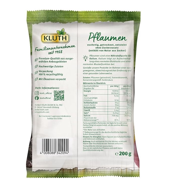 Thành phần: Mận (sấy khô), dầu hướng dương, axit sorbic. Có thể chứa một lượng nhỏ các loại đậu phộng và các loại hạt khác.