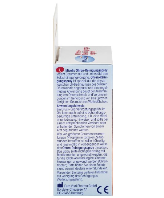 Xịt làm sạch tai Mivolis Ohren Reinigungs Spray là sản phẩm y tế dùng để hỗ trợ quá trình tự làm sạch tai một cách đơn giản chỉ bằng cách xịt. Dung dịch dạng xịt làm mềm và hòa tan ráy tai (cerum) và các chất bẩn tích tụ trong tai, giúp các tạp chất tự đào thải ra ngoài mà không cần dùng tăm bông. Giúp làm sạch tai một cách dễ dàng, an toàn và hiệu quả, tránh mọi tổn thương. Dành cho người lớn và trẻ em từ 3 tuổi. Không chứa Gluten, không chứa latose, thuần chay.