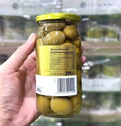 Thành phần: Ô liu xanh, nước, giấm, muối, (axit lactic, axit citric).