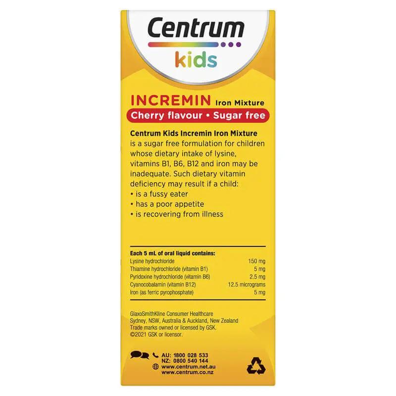 Siro Centrum Kids Incremin Iron Mixture giúp bổ sung Lysine, sắt và vitamin nhóm B (B1, B6, B12) và các chất dinh dưỡng cho trẻ biếng ăn, kén ăn hay đang hồi phục sau khi ốm. Kích thích thèm ăn, giúp trẻ ăn ngon miệng. Cải thiện hấp thu dinh dưỡng, tăng cường trao đổi chất. Hỗ trợ phát triển: Cung cấp dinh dưỡng cần thiết cho sự phát triển thể chất và trí tuệ, đặc biệt là tăng chiều cao. Dạng siro vị cherry thơm ngon dễ uống. Dùng cho trẻ từ 6 tháng tuổi. Không chứa đường.