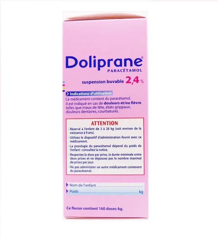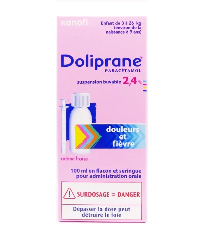 Siro hạ sốt Doliprane Paracetamol 2,4% của thương hiệu Sanofi Pháp, với hoạt chất paracetamol giúp giảm đau, hạ sốt nhanh chóng trong 15-20 phút, cho trẻ từ 3-26 kg tương ứng với bé sơ sinh đến 9 tuổi. Siro giúp hạ sốt nhanh chóng trong các trường hợp cảm lạnh, nhiễm trùng đường tiêu hóa, viêm amidan, sốt mọc răng, sốt do tiêm phòng… và giảm đau hiệu quả cho các cơn đau nhẹ đến vừa. Không chứa đường, lactose, gluten, cồn hoặc phẩm màu.