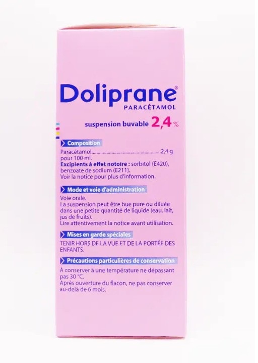 - Doliprane chứa paracetamol (2,40 g/100 ml). Tá dược bao gồm axit malic, xanthan gum, maltitol lỏng (LYCASIN), sorbitol kết tinh 70%, sorbitol, axit citric khan, ethyl, methyl và propyl hydroxybenzoat (NIPASEPT), hương vị dâu tây và nước tinh khiết.
