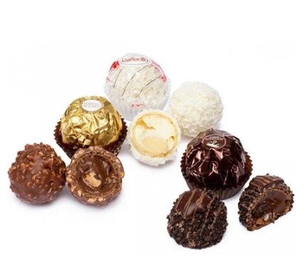 - Confetteria Raffaello (viên trắng): Socola dừa, viên socola hình cầu được phủ một lớp dừa vụn sấy giòn bên ngoài, tới lớp vỏ bánh xốp giòn tan, nhân kem sữa béo ngậy bên trong, một hạt hạnh nhân giòn nguyên vị.