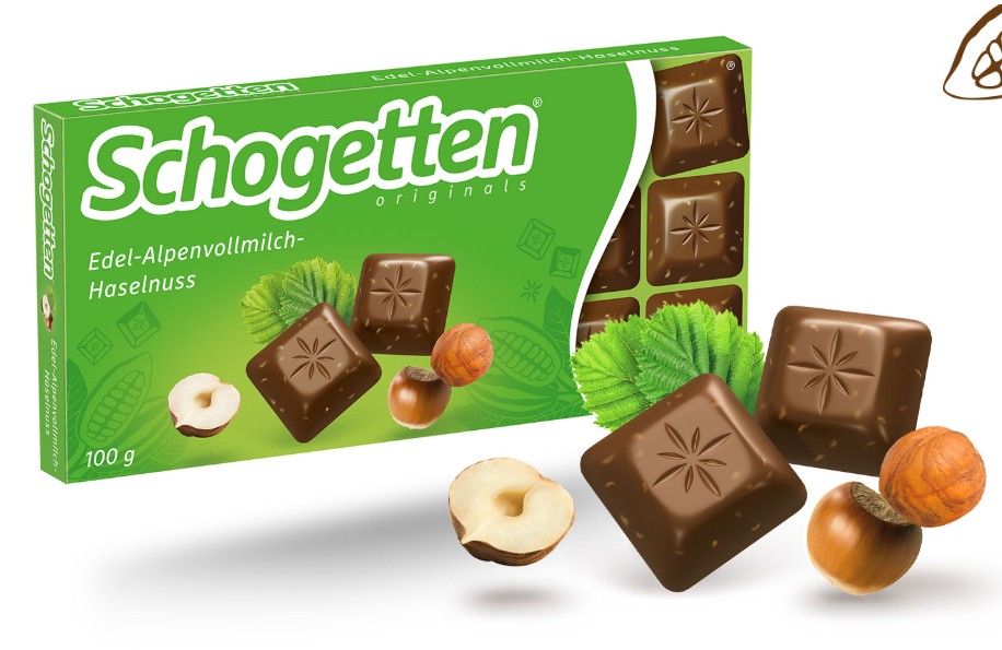 - Schogetten Edel-Alpenvollmilch-Haselnuss (Xanh lá): socola sữa nhân kem sữa Alpine với hạt phỉ giòn.