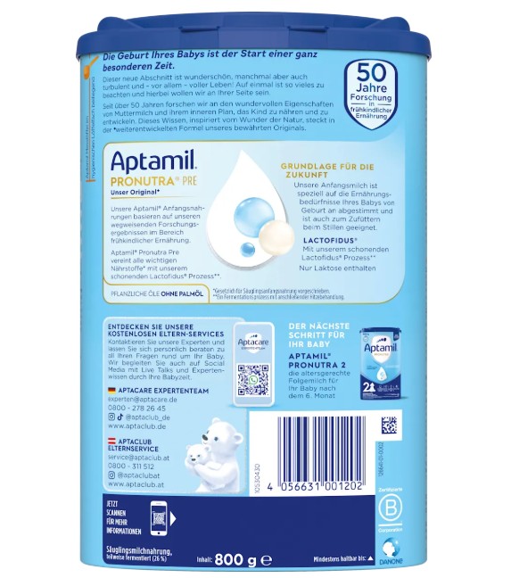 Sữa Aptamil PRE Anfangsmilch cho bé từ 0-6 tháng tuổi, với thành phần dinh dưỡng được thiết kế đặc biệt phù hợp cho bé sơ sinh ngay từ khi sinh ra. Nó chứa hỗn hợp chất xơ đã được cấp bằng sáng chế và LCP – axit béo không bão hòa đa chuỗi dài mà trẻ không thể tự sản xuất đủ trong vài tháng đầu tiên. Cung cấp đầy đủ vitamin, khoáng chất đáp ứng dinh dưỡng toàn diện, bổ sung thêm DHA hỗ trợ phát triển não bộ, hệ thần kinh và thị lực của bé.