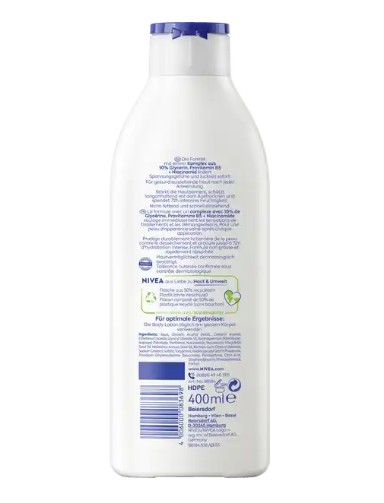 Sữa dưỡng thể Nivea Body Lotion Repair & Care 72h đặc biệt thích hợp cho da rất khô. Được sản xuất hoàn toàn từ tự nhiên, không có hoá chất nhân tạo và Silicon, cùng công thức cải tiến với phức hợp 10% glycerin, provitamin B5, niacinamide, các khoáng chất biển và Hydra IQ giúp dưỡng ẩm, làm dịu tức thì cảm giác căng tức và ngứa ngáy. Dexpanthenol tạo nên một hàng rào bảo vệ da khỏi bị khô, thời gian chăm sóc đến 72h. Da được ngậm nước trong một thời gian dài, làm ẩm mịn da và giúp da thư giãn.