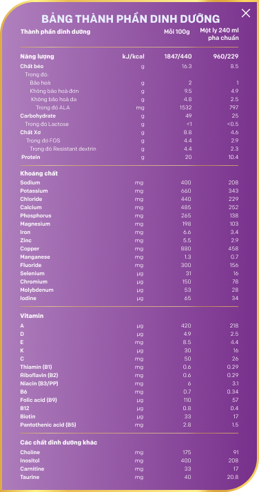 - Giàu chất xơ hòa tan: Chứa hỗn hợp FOS và Resistant Dextrin, hỗ trợ hệ tiêu hóa hoạt động khỏe mạnh.