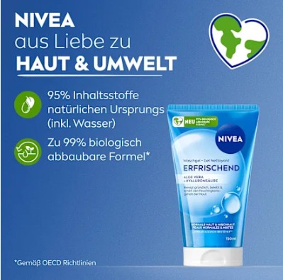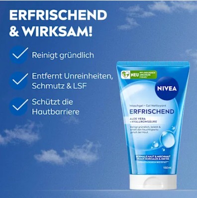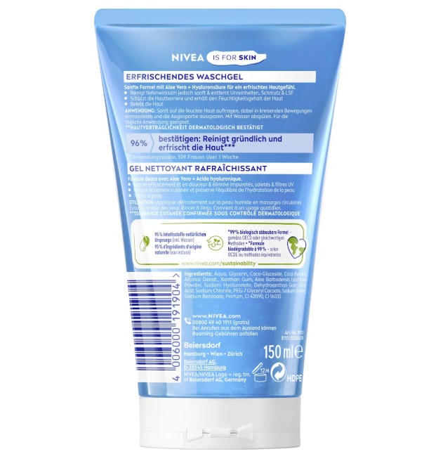 Sữa rửa mặt NIVEA Waschgel Erfrischend với lô hội aloe vera và axit hyaluronic được thiết kế đặc biệt cho da thường và da hỗn hợp để làm sạch da nhẹ nhàng nhưng triệt để. Loại bỏ tạp chất, bụi bẩn và kem chống nắng đồng thời duy trì cân bằng độ ẩm tự nhiên của da. Công thức dạng gel tạo bọt nhẹ với mùi tươi mát mang lại cảm giác sạch sẽ dễ chịu cho làn da.