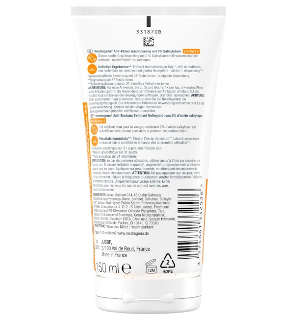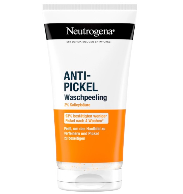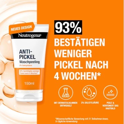 Sữa rửa mặt trị mụn Neutrogena Anti Pickel Waschpeeling không chứa dầu, rửa mặt tẩy tế bào chết và trị mụn. Làm sạch triệt để, loại bỏ bã nhờn dư thừa và cải thiện làn da. Với axit salicylic giúp loại bỏ những nốt mụn cứng đầu và duy trì hàng rào bảo vệ tự nhiên của da, ngăn ngừa mụn mới xuất hiện, cho làn da sạch hơn, đều màu hơn. Hạt scrub tẩy tế bào chết nhẹ nhàng, cho làn da mịn màng hơn. Hỗ trợ quá trình tái tạo da tự nhiên. Thích hợp cho da dầu mụn và cả làn da nhạy cảm.