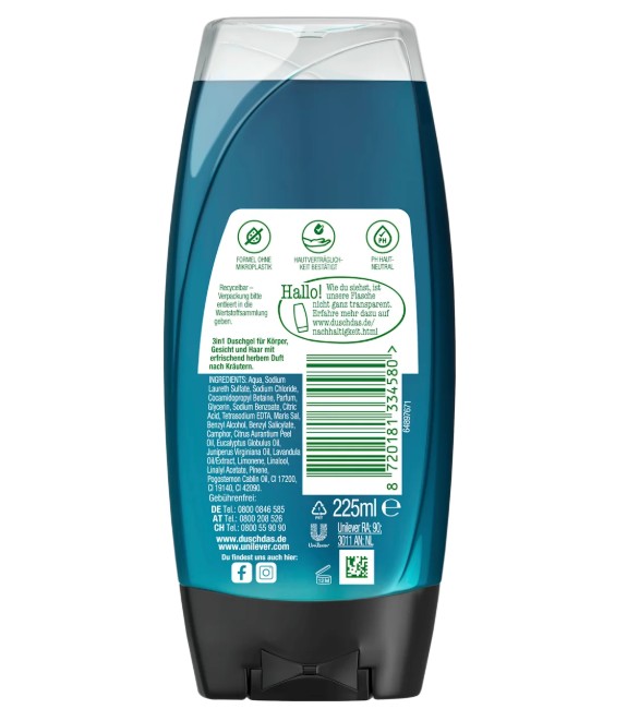 Duschdas là hãng mỹ phẩm nổi tiếng của Đức, được yêu thích vì sản phẩm chất lượng, đa dạng mùi hương mà giá cả rất hợp lí, đúng với tiêu chí của người dân Đức. Tắm gội nam duschdas For Men 3in1 với hương thơm Zitrus-Duft tươi mát đánh thức các giác quan của bạn, cho bạn ngày mới năng động và sảng khoái.