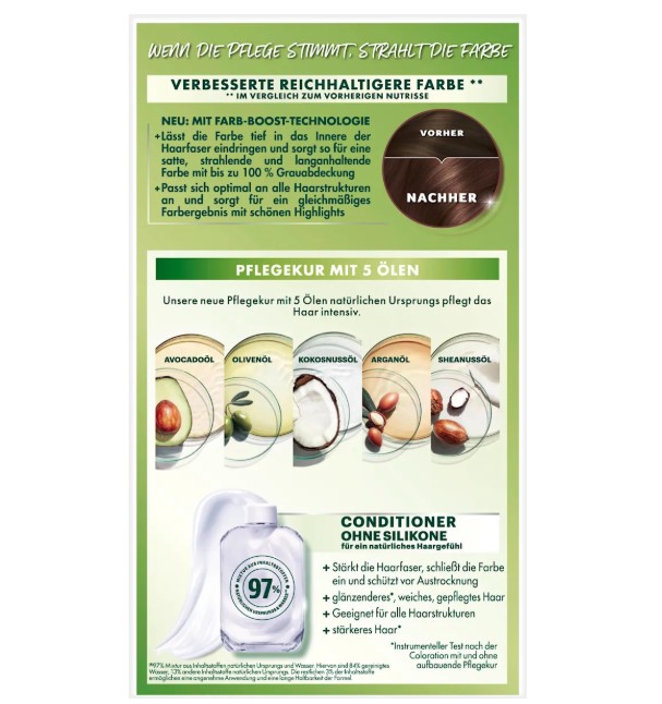 - 5 loại dầu dưỡng trong thuốc nhuộm tóc Garnier Nutrisse: dầu bơ avocado, dầu olive, dầu hạt shea, dầu trái Nam việt quất, dầu Argan.
