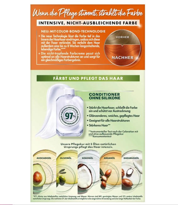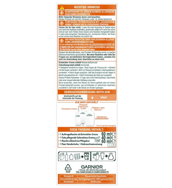 Thuốc nhuộm tóc Garnier Nutrisse với công thức nuôi dưỡng tóc chuyên sâu, được làm giàu với 5 loại dầu dưỡng giá trị, giúp tóc hấp thụ màu tốt hơn, bền màu hơn, mề mượt và sáng bóng. Hơn nữa còn che phủ cả tóc bạc cứng đầu 100%. An toàn cho tóc và da đầu.