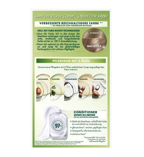 - 5 loại dầu dưỡng trong thuốc nhuộm tóc Garnier Nutrisse: dầu bơ avocado, dầu olive, dầu hạt shea, dầu trái Nam việt quất, dầu Argan.