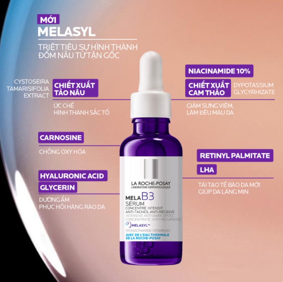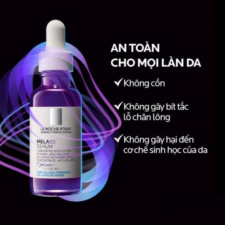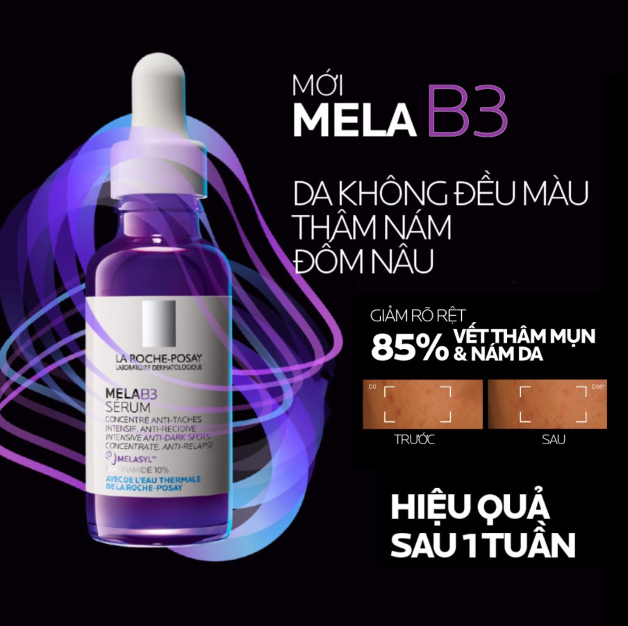 Tinh chất La Roche-Posay Mela B3 Serum là tinh chất chuyên biệt giúp trị nám, làm sáng da, mờ thâm nám và đốm nâu hiệu quả cao. Nhờ công nghệ độc quyền Melasyl được cấp bằng sáng chế và 10% Niacinamide đậm đặc giúp điều trị hiệu quả ngay cả các vết nám dai dẳng. Giúp da sáng mịn đều màu, ức chế melanin, ngăn ngừa sự xuất hiện của các đốm sậm màu. Kết cấu lỏng nhẹ, thấm nhanh, không gây bết dính. Phù hợp cho mọi loại da, kể cả da nhạy cảm.