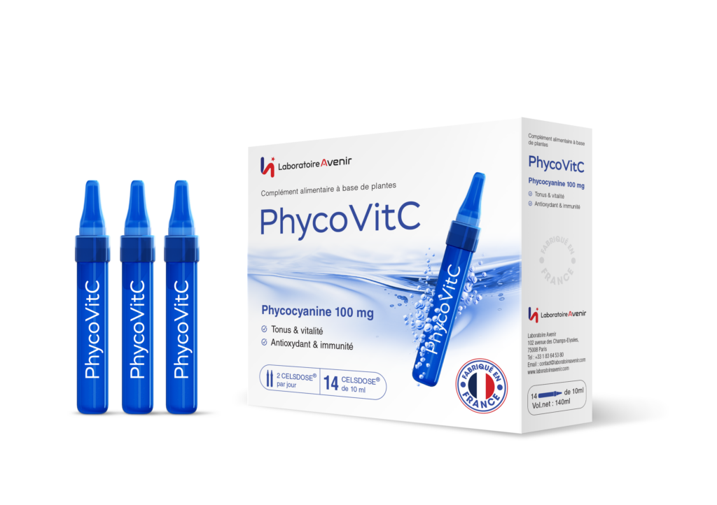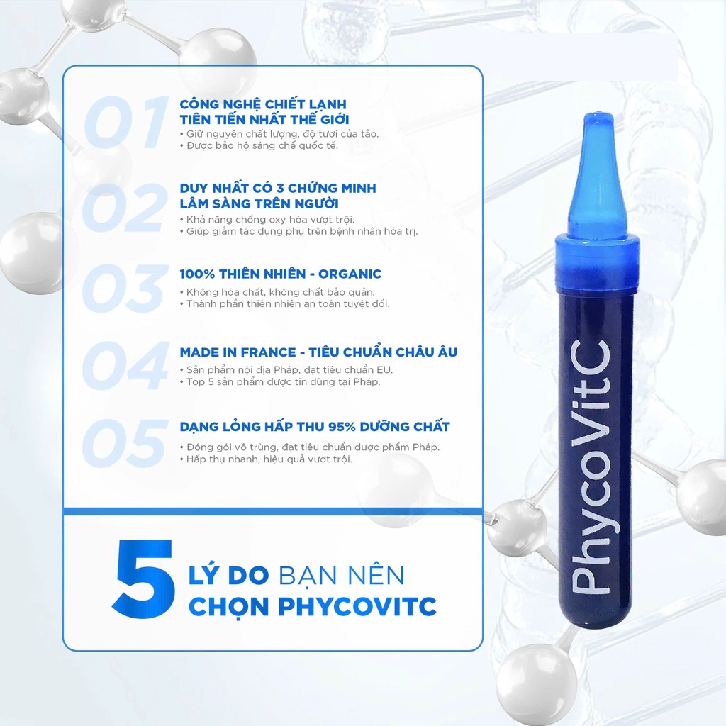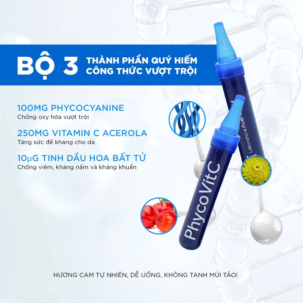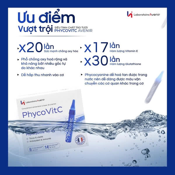 Tinh chất tảo tươi Laboratoire Avenir PhycovitC là thực phẩm bổ sung cao cấp của Pháp, với chiết xuất Phycocyanine từ tảo xoắn Spirulina, Vitamin C và tinh dầu hoa bất tử. Sử dụng công nghệ ép lạnh tiên tiến giữ nguyên dưỡng chất và tăng khả năng hấp thu đến 95%. Giúp chống oxy hóa mạnh, chống lão hóa, làm da sáng mịn săn chắc, hỗ trợ thải độc và tăng cường miễn dịch, ngăn ngừa bệnh do gốc tự do gây ra. Hỗ trợ sức khỏe tổng thể và vẻ đẹp từ bên trong.