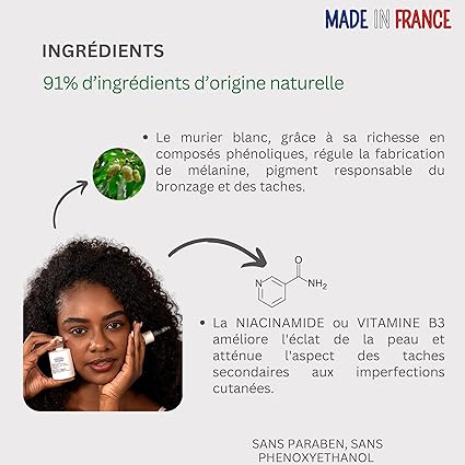 - Siêu đậm đặc: với nồng độ cao các thành phần hoạt tính làm sáng (Chiết xuất dâu tằm trắng hữu cơ giàu phenolic, Niacinamide, vitamin B3).