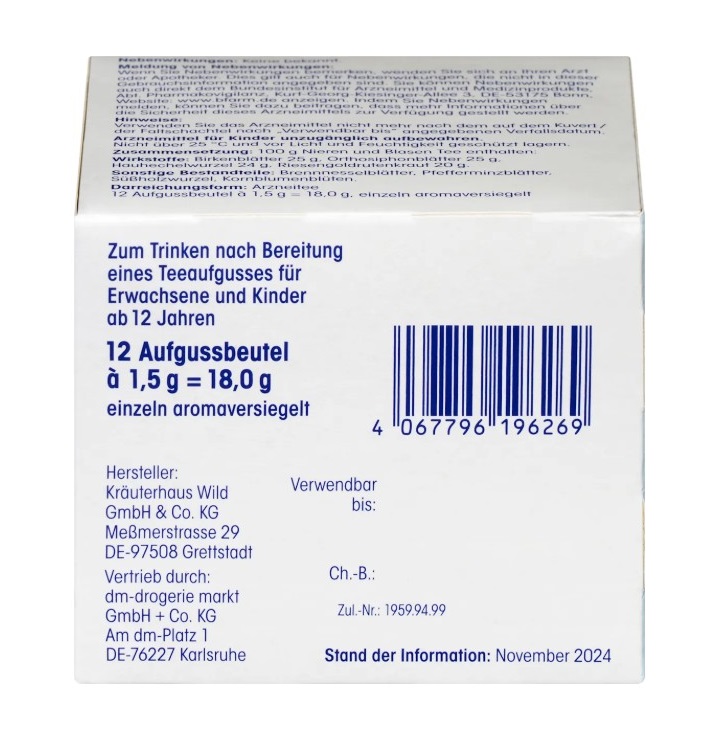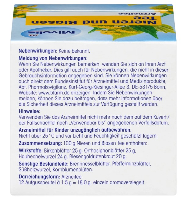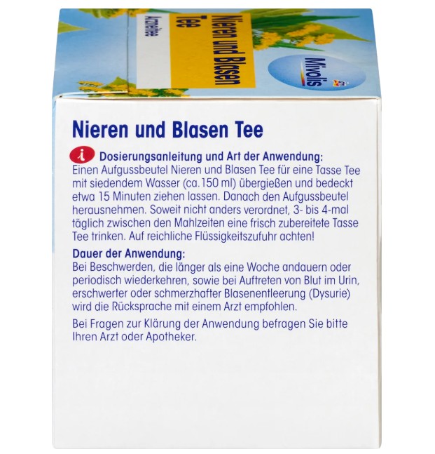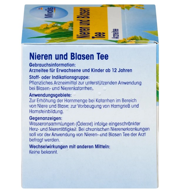 Trà thảo dược Mivolis Nieren & Blasen Tee bổ thận, bàng quang kết hợp các thành phần thảo dược gồm lá bạch dương, lá tầm ma và lá bạc hà…, giúp hỗ trợ điều trị viêm bàng quang và thận, phòng ngừa sỏi tiết niệu và sỏi thận. Dạng túi lọc tiện dụng. Dùng được cho người lớn và trẻ em từ 12 tuổi.