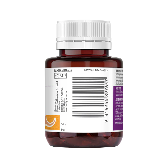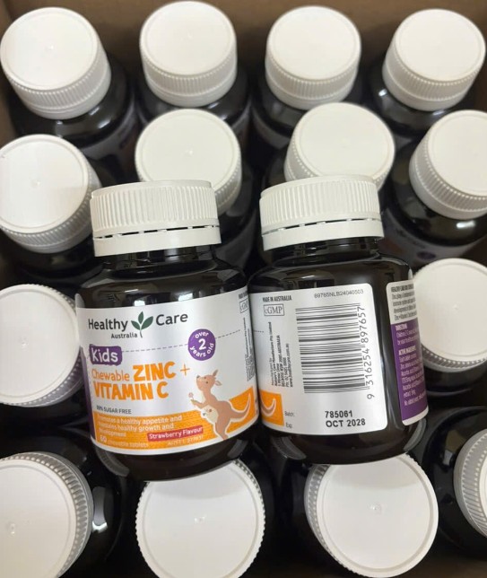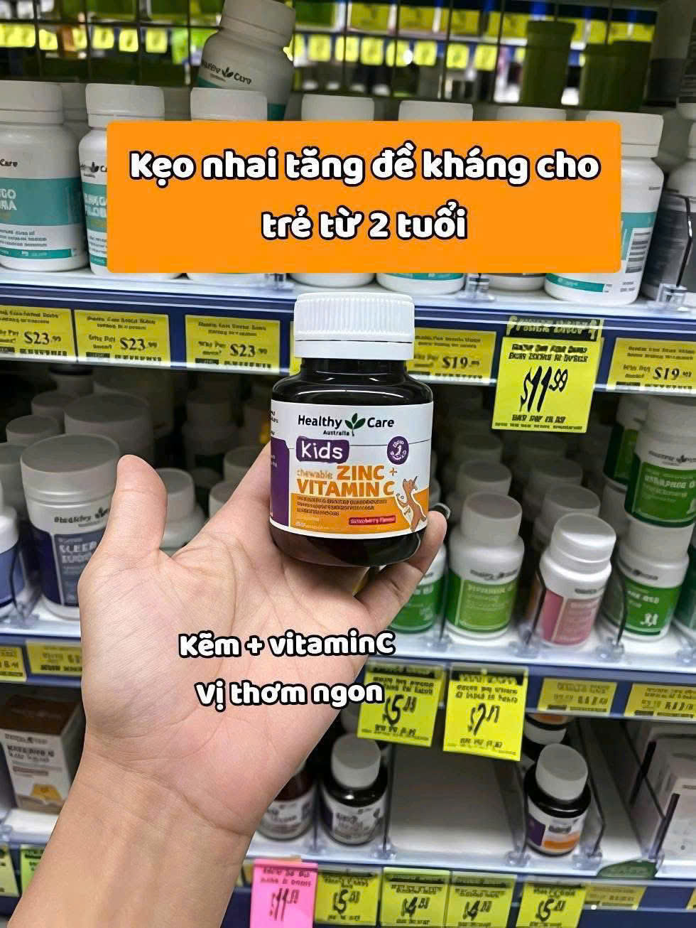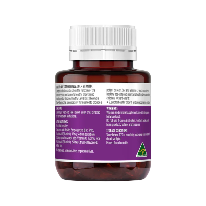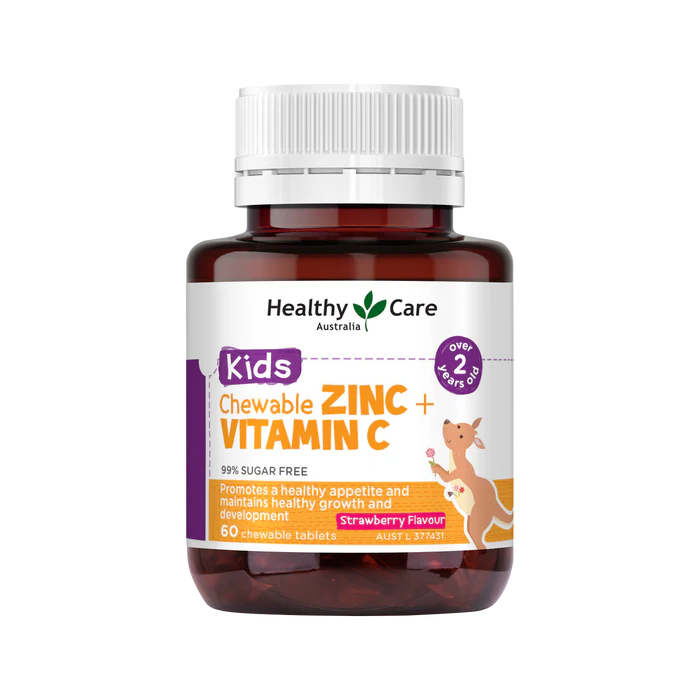 Viên nhai Healthy Care Kids Chewable Zinc + Vitamin C bổ sung kẽm và vitamin C, hỗ trợ hệ miễn dịch và sự tăng trưởng của trẻ đang phát triển. Kẽm là một khoáng chất thiết yếu đóng vai trò quan trọng trong chức năng miễn dịch, sự phát triển và tăng trưởng tế bào, đặc biệt là trong thời thơ ấu. Kết hợp với Vitamin C, một chất chống oxy hóa mạnh mẽ, hỗ trợ hệ miễn dịch khỏe mạnh và điều chỉnh sự thèm ăn, thúc đẩy sức khỏe tổng thể và sự phát triển tối ưu ở trẻ em. Không chứa men, dẫn xuất sữa, chất bảo quản.
